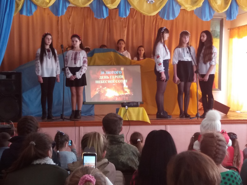 Виховний захід "СТОЇТЬ МАЙДАН БРАТІВ - ПЛЕЧЕ В ПЛЕЧЕ" присвячено пам'яті Героїв Небесної Сотні. Педагогом-організатором школи складено сценарій заходу з використанням комп'ютерної презентації, де відображено події 20 лютого 2014 року. Участники заходу учні 5-11 заходів декламували вірші, співали патріотичних пісень. На виховний захід учнями школи було запрошено учасників АТО - колишніх випускників нашої школи.